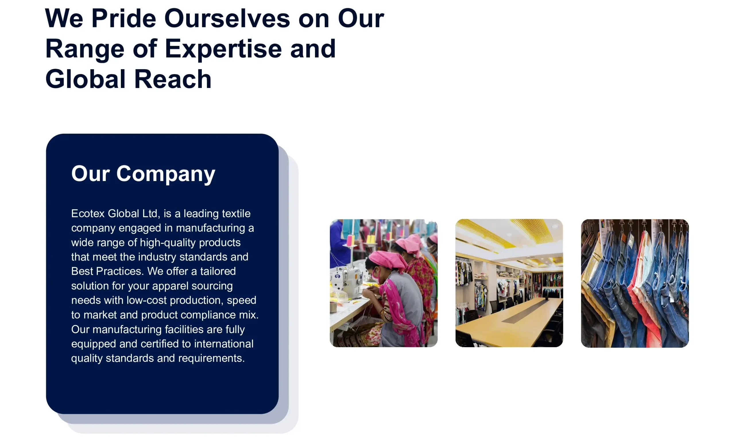 Ecotex Global Limited is a complete one stop solution for textile buyers looking to procure effectively from Bangladesh. We understand the challenges involved and work in partnership with our clients to address the risks and deliver results to the bottom line.