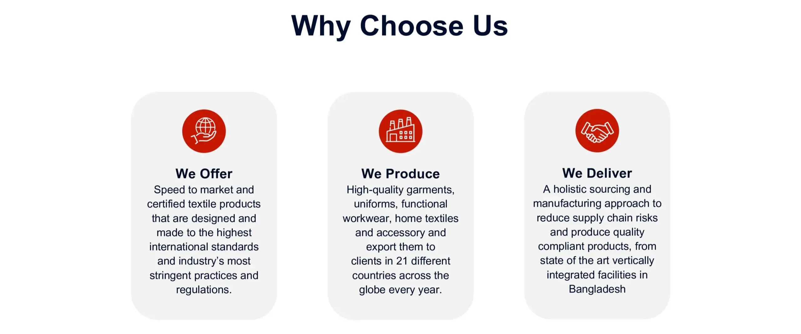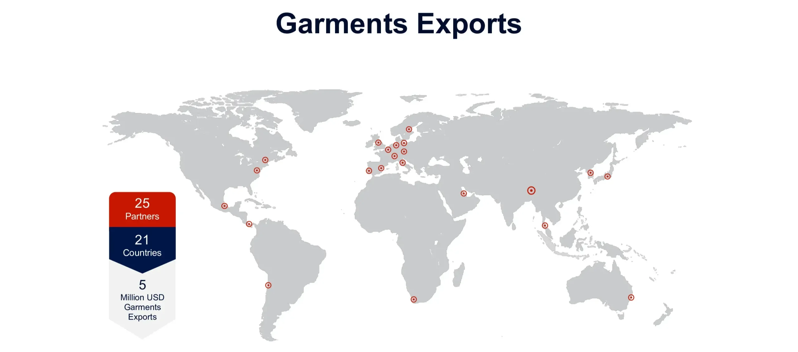 A trusted supplier of high quality apparel with an excess value of 5M USD exported to more than 21 countries around the world.